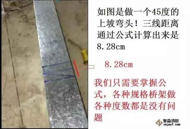 总结出来的公式:比如45度的坡度弯头,你只要记住这句话就知道怎么做了"爬坡45度,桥架高度乘以0.8中分划三条线为一个弯,斜边是爬坡高度乘以1.41,30度是桥架高度乘以0.8除以45乘以30中分划三条线为一个弯,斜边是爬坡高度乘以2水平90度弯是桥架宽度乘以0.8中分划线,斜边(内边)600以上200乘以1.41 600以下100乘以1.41"。