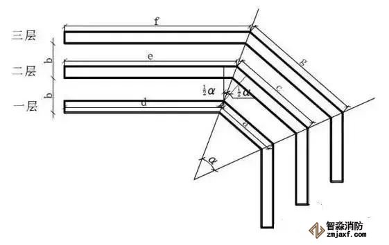 制作方法同第二层弯头f=e+btg1/2α,g=2btg1/2α+c注:多列等间距等宽桥架任意角弯头的制作方法与多层等间距等高桥架任意角弯头的制作方法相同。