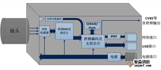 网络摄像机一般由镜头、图像传感器、声音传感器、A/D转换器、图像、声音、控制器网络服务器、外部报警、控制接口等部分组成。