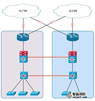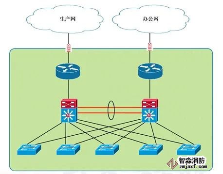 在原核心交换机sw1和接入sw3,sw4,sw5间加入汇聚new1,原核心交换机sw2和接入sw6,sw7间加入汇聚new2。