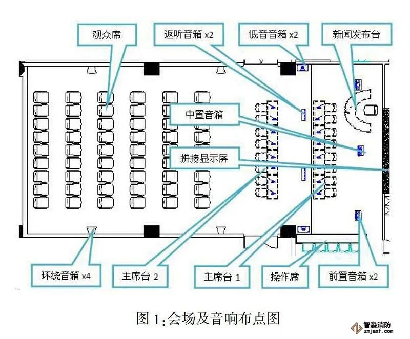 扩声系统按7.2声道家庭影院模式布置(见图1)。最佳视听范围为观众席前2排及主席台2后方的中间区域,支持2.1、5.1、5.2、7.1、7.2多种声道模式。另为主席台1区域配置2只吊挂返听音箱。
