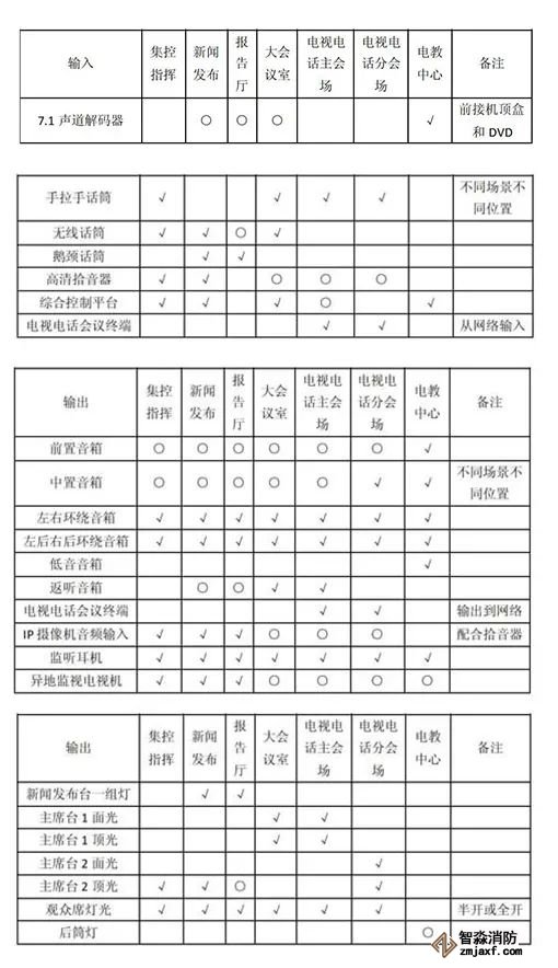扩声系统的核心是一套16进16出数字音频媒体矩阵。实际为影院模式配置了一台7.1声道解码器。限于篇幅不列音视频系统图。通过下面两表描述不同模式下输入输出的总体设置(“√”为使用,“O”为可选):