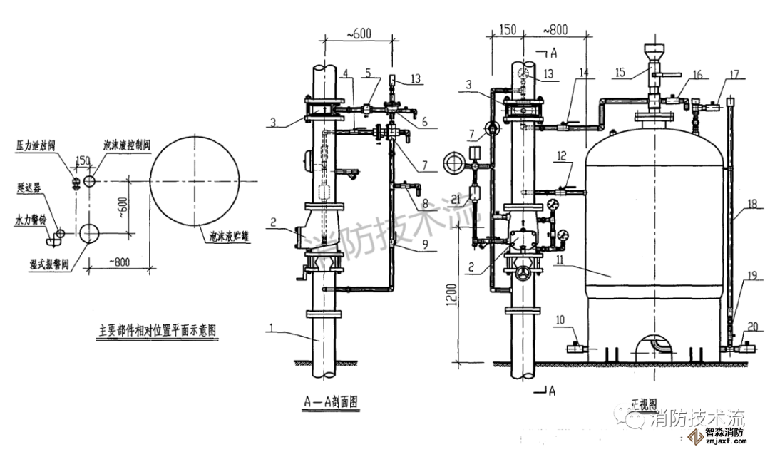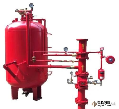 系统的原理是泡沫液与水通过泡沫比例混合器混合成泡沫混合液,经泡沫产生器与空气混合产生泡沫,再通过不同的方式最后覆盖在燃烧物质的表面形成泡沫层,由于泡沫层的冷却、隔绝空气和抑制等作用从而使火灾熄灭。