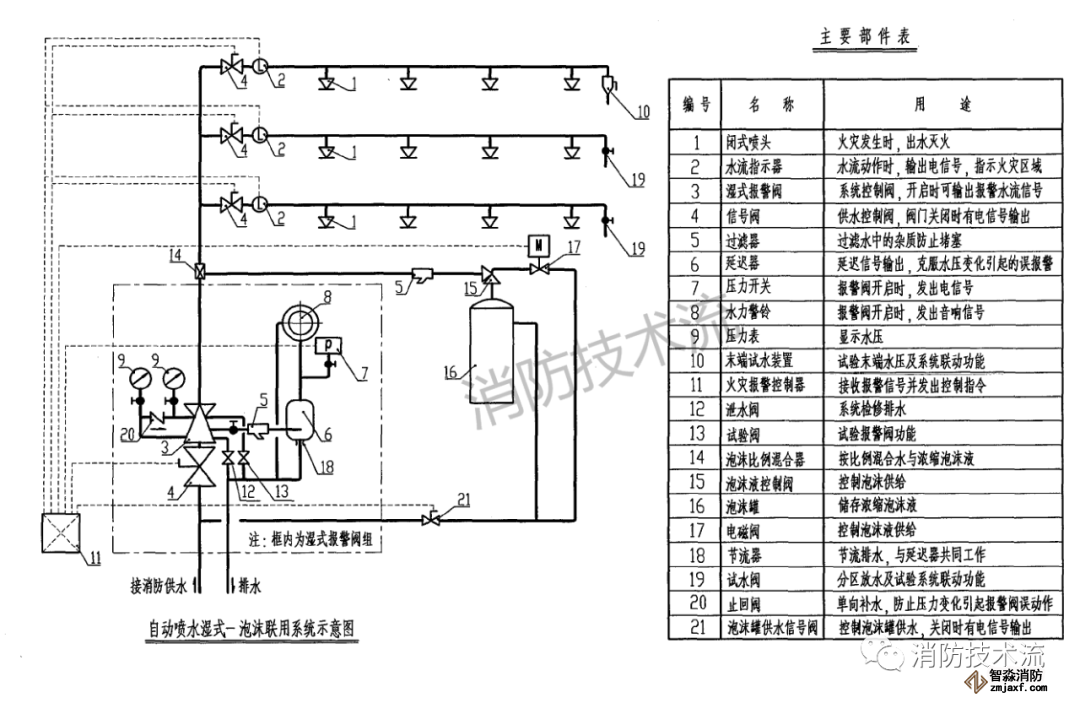 自动喷水-泡沫联用灭火系统是在自动喷水灭火系统中配置可供给泡沫混合液的设备,组成既可以喷水又可以喷泡沫的固定灭火系统。同时既可以是开式也可以是闭式系统(根据保护场所需要选择系统类型)。