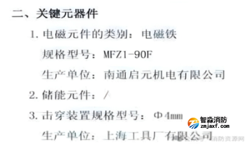 示例1:某柜式七氟丙烷灭火装置型式《检验报告》列示有电磁驱动装置的关键元器件,现场产品的电磁铁等的规格型号和生产单位应与型式《检验报告》一致。