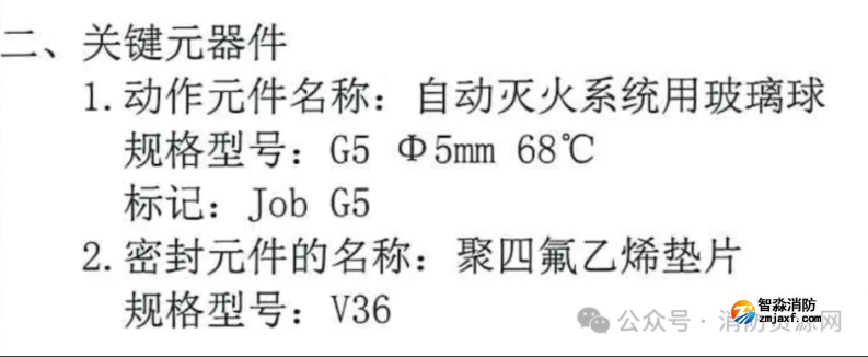 示例2:某洒水喷头的型式《检验报告》列示有玻璃球等关键元器件,现场产品的玻璃球标记等应与型式《检验报告》一致。