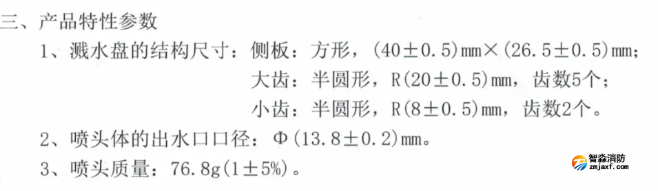 示例1:某边墙型洒水喷头的型式《检验报告》列示有结构尺寸、出水口口径和喷头质量等产品特性参数,现场产品应与型式《检验报告》一致。
