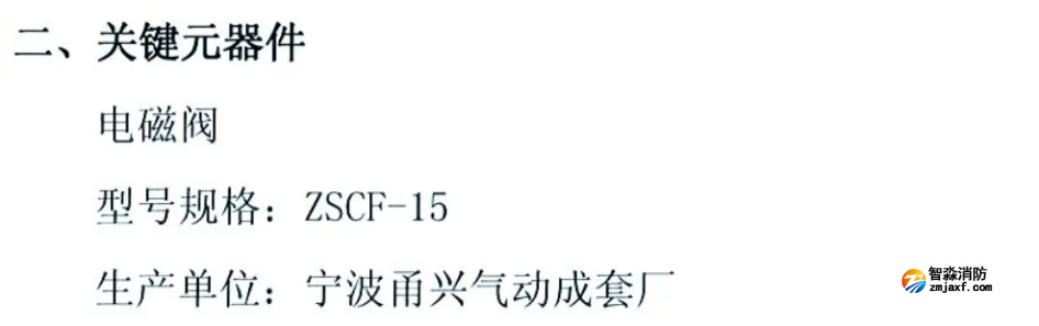示例3:某预作用阀组型式《检验报告》列示有电磁阀型号及生产单位,现场产品的电磁阀规格型号和生产单位应与型式《检验报告》一致。