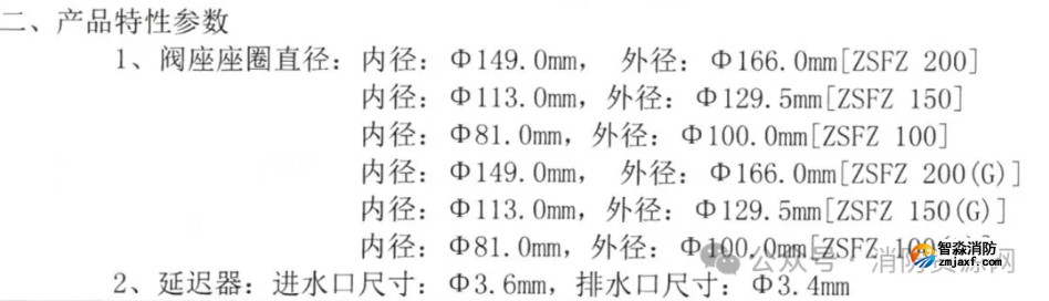 示例2:某湿式报警阀组的型式《检验报告》列示有阀座座圈和延迟器参数,现场产品应与型式《检验报告》一致。
