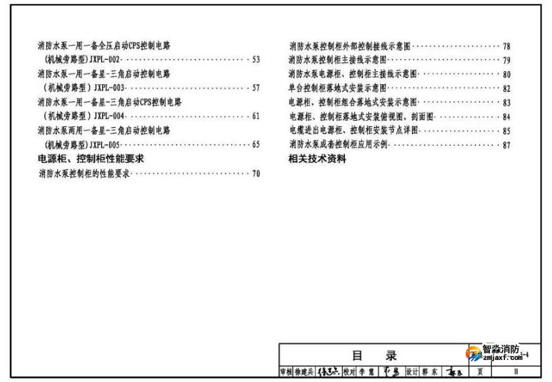 ① 图集编制了控制柜相关方面的性能要求。包括控制柜、断路器、过载保护器(EOP)、电子控制装置(ECU)、机械应急启泵控制、CPS、控制电路等性能要求及现场应急操作要求和紧急停机控制、断电维护操作要求等。