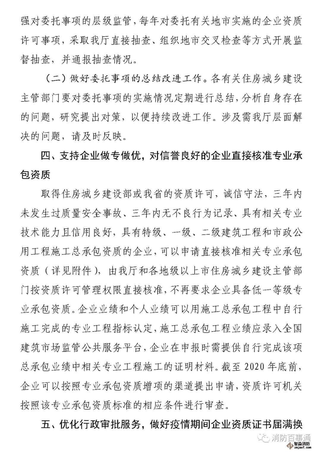 信誉良好的企业直接核准专业承包资质。诚信守法,3年内未发生过质量安全事故、三年内无不良行为记录、具有相关专业技术能力且信用良好,具有一级、二级建筑工程和市政公用工程施工总承包资质的企业,可以申请直接核准相关专业承包资质,由省厅和我局按资质许可管理权限直接核准,不再要求企业具备低一等级专业承包资质。申请截止时间为2020年底前。