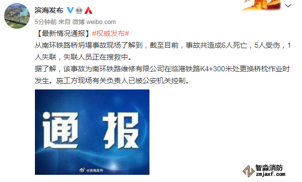 据了解,该事故为南环铁路维修有限公司在临港铁路K4+300米处更换桥枕作业时发生。施工方现场有关负责人已被公安机关控制。