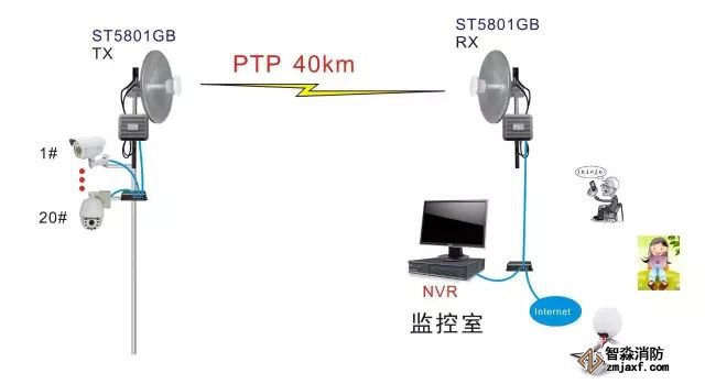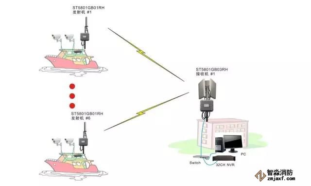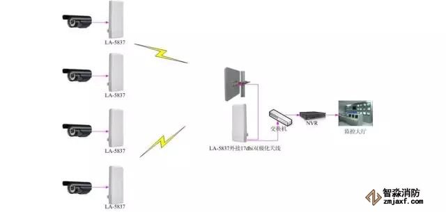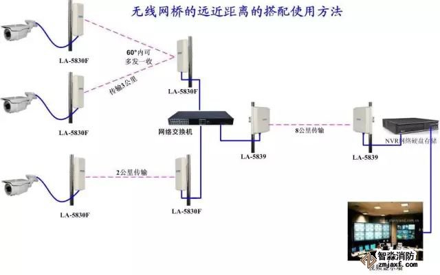 前端监控摄像机点位的分布决定前端无线网桥怎样分布,如果多台摄像机可以集中的话我们可以将多台摄像机信号集中后再发射,如果不能集中我们可以采取多个发射一个接收的方式来实现无线视频传输。