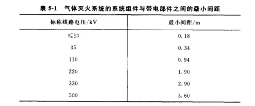 (2)气体灭火系统的组件与带电部件之间的最小间距,应符合表5-1的规定。