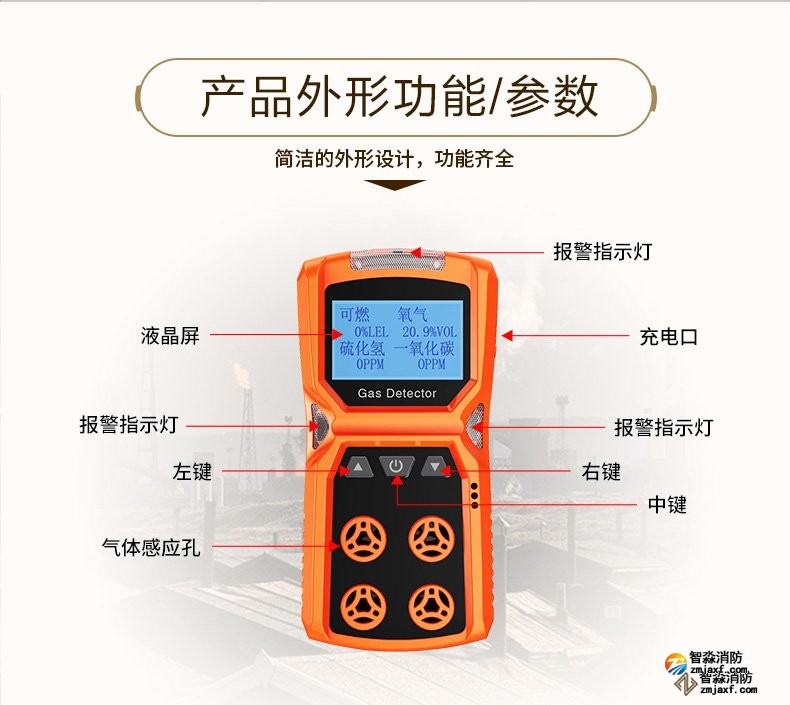 产品简介:便携式四合一可燃气体检测仪用于可燃气体,氢气氨气液化石油气,甲烷等用于防爆场所的可燃气体,氢气氨气液化石油气,甲烷等,连续检测工业现场、巷道等环境中可燃气体浓度。