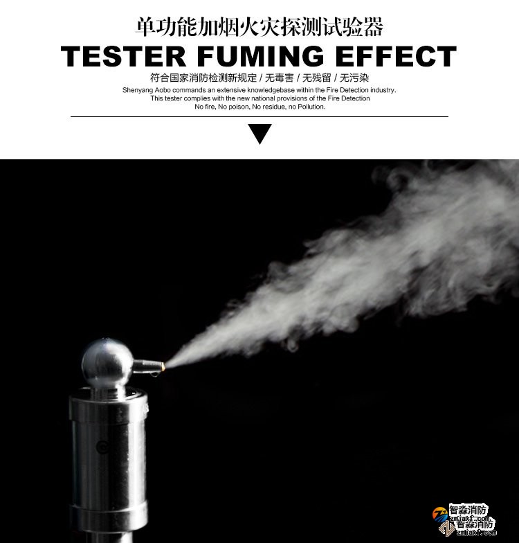 该产品由于采用特制的雾香液电子雾化技术,发出的烟雾有各种香味且绿色环保,无毒无害。根据火灾探测器倒挂在顶棚上的状况,为避免加烟后烟雾长时间滞留在火灾探测器迷宫内,特制雾香液雾化成烟后的比重大于空气比重,加烟试验后短时间内能在迷宫内快速消失,有利于提高试验工作效率。电子雾化发烟代替原有的传统的棒香加烟方式,不仅加烟方式有了进一步的升华而且烟雾中不含烟尘烟油,可避免棒香加烟所产生的烟尘烟油对火灾探测器造成二次污染。同时由于该产品采用了内部雾香液循环技术,降低雾香液的自然损耗,延长了雾香液使用时间,耗材使用成本随之减少。