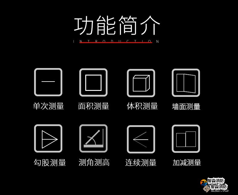 激光测距仪量程不小于50m;精度:3mm测量距离、面积、空间、体积